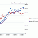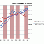 To explore the hypothesis, we can qualitatively compare the trends in government employee and family incomes to the size of government. Let’s begin with periods of increase in the size of government.