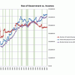 In addition, the income data seems to track recession data very well. Regarding the Presidential data, Democratic Presidents have presided over the two largest decreases in the size of government (Truman and Clinton), and Truman presided over a period of sharp increase in the size of government later in his Presidency. Presidents from both parties have presided over large increases in the size of government: Truman, Johnson, and Reagan. Republican Presidents tend to preside over periods of no, little, or slightly declining government growth, while for Democratic Presidents it’s more mixed.
