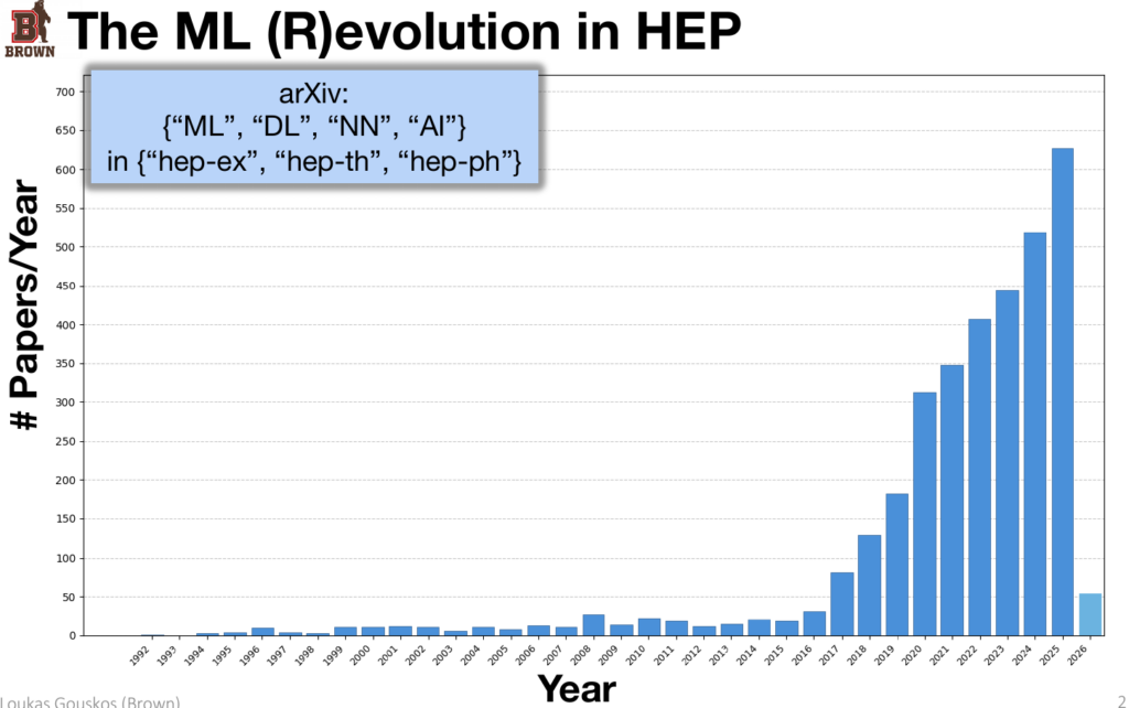 I will close by showing a really nice figure, presented by Loukas Gouskos, on the growth of machine learning and, eventually, artificial intelligence algorithms, in high-energy physics. The modern era of deep learning, transformers, and other advanced configurations or concepts has rocketed this subject to a forefront location.