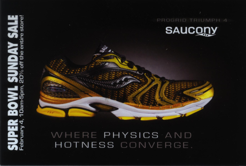 Not only has Saucony made a reappearance in my life, it now uses one of my favorite subjects to advertise its own product. “Where physics and hotness converge.”
