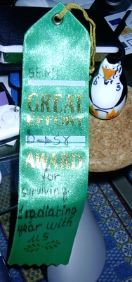 There was a celebration on Friday marking the conclusion of an era for this analysis on BaBar. For my role in the process, I was awarded the “Semi-Great Effort (b->sγ) Award for Surviving 1 Radiating Year With Us” prize. See the picture below. This rare and prestigious award has only been given out to two others, also on Friday. Like the Nobel Prize, it can only go to a maximum of three people – quite nicely, that’s the number of the reviewers on this analysis!
