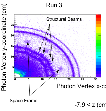 Out of sheer interest, I decided to see if I could spot differences in our tracking system between Run 3 and Run 5 by imaging our detector. How do you do this, when you can’t crack it open or go and x-ray it from the outside? Simple: x-ray it from the inside. One of the properties of the quantum of light, the photon, is that in the presence of matter it can produce a electron-positron pair. Since this must happen in material, you can “see what cannot be seen” by looking for the emerging electron and positron and tracking their trajectories back to their point of origin. Thus, one can radiograph the inner detector system. See the sample image below: